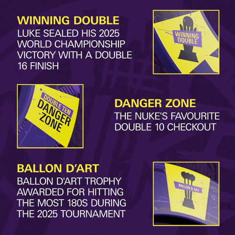 The World Champion Edition Surround celebrates Luke’s greatest moments, including his iconic “Winning Double” (double 16), the “Danger Zone” (double 10), and the Ballon D’Art Trophy for most 180s. Made from durable active reflex polymer, it offers puncture resistance while maintaining a sleek, professional look. The ribbed back ensures a snug fit around the dartboard without the need for wall fixings, making it the perfect addition to any game room.