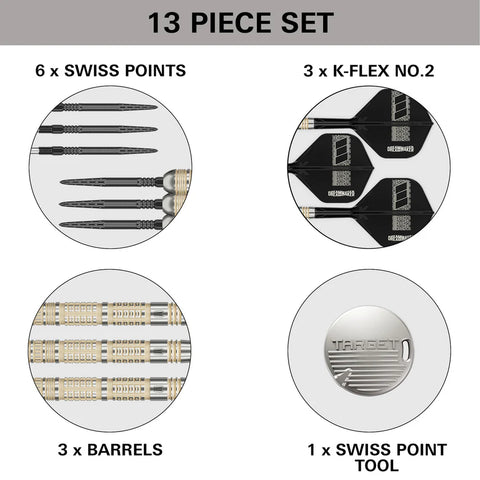 Each dart is equipped with Swiss DX Points, combining the grip of Target’s Diamond Pro and Fire points into one seamless design. Featuring a laser-etched diamond pattern at the front, the point tapers into a machined fire grip for optimal board hold and finger traction. The patented Swiss Point system allows players to easily switch points with the included Swiss Point key tool, and 30mm spare Swiss DX points.